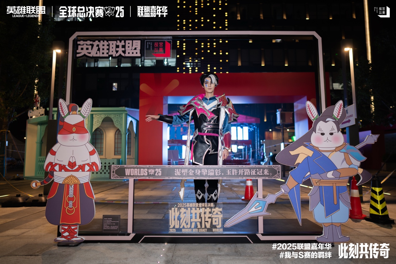 작품은베이징전통공예품'토아예'에서영감을받아, 리그오브레전드캐릭터인리칭, 자오신과전통적인서수의이미지를융합하여'경갑토끼예'라는힘과영성이넘치는이미지를만들어냈습니다. 작품은전체적으로명쾌한붉은색과노란색의조화가주를이루며, 경극얼굴과전투갑옷요소를융합하여전통신앙과현대경기의공감을상징합니다. 창작자가말한것처럼, "우리는베이징의지역문화상징을사용하여e스포츠선수들의용감하게나아가는정신을표현하고, 관객들이전통과e스포츠가대립하는것이아니라문화에너지의전달임을느끼게하고자합니다." 관객들은인증샷과사진촬영을할때마치'토끼출정'의뜨거운분위기속에있는듯, 저마다'소환사'로변신하여빛과그림자가어우러진무대앞에자신의'경쟁의흔적'을남깁니다.