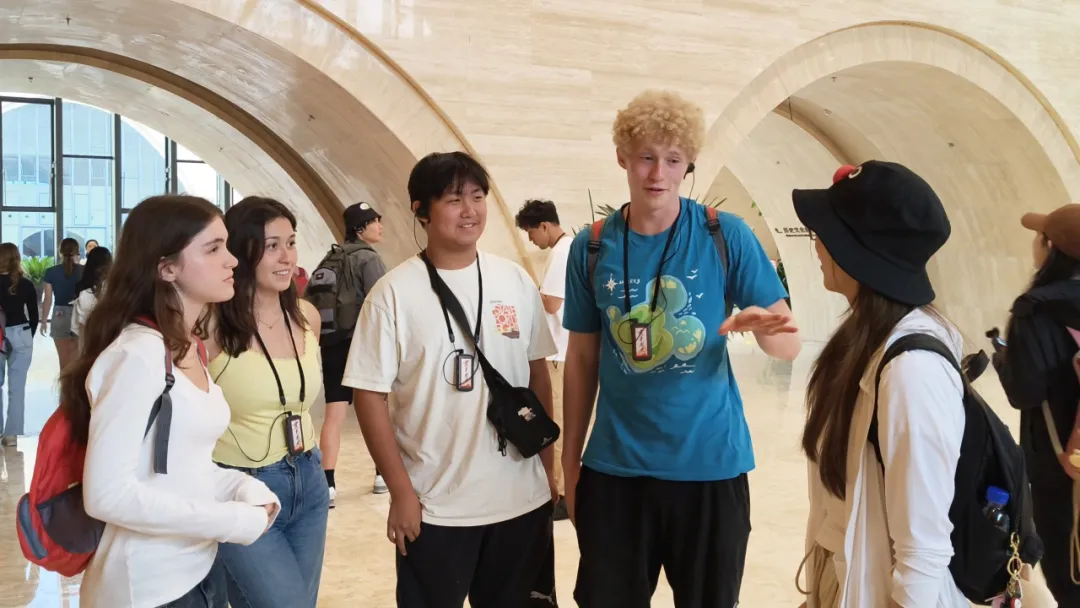 본 학원 학생이 옌안박물관에서 미국 플라잉 타이거 우정학교 청소년 연수단에게 영어 해설을진행하는 장면