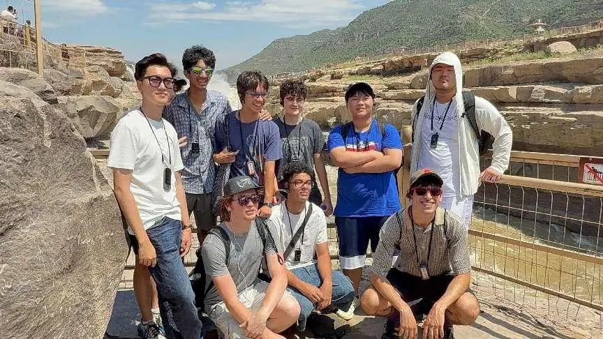 미국 플라잉 타이거 우정학교 청소년 연수단과 본 학원 교직원·학생들이 황허 호구(후커오) 폭포(黃河壺口瀑布)에서 함께 촬영한 기념사진