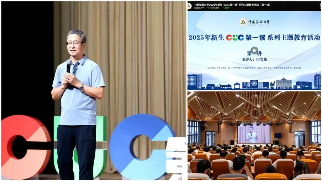 9월16일오후, 중국전매대학 ‘CUC 제1강’ 시리즈주제교육활동이중전예당에서열렸다. 첫강연에는본교신문학과85학번동문이자중국중앙방송총국아나운서인바이옌쑹(白岩松) 교우가초청되어, 2025학번신입생들과40년의세월을잇는 ‘이상의대화’를나눴다.