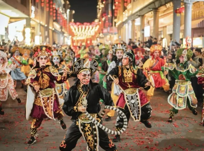 명절만 되면 차오산 지역에서는 잉거우 춤을 춥니다. 가로등 불빛 아래, 그들은 양산 호한(梁山好漢)의 분장을 하고 잉거우 채찍을 휘두르며, 동작은 건장하고 힘차며 리듬은 강렬했습니다.